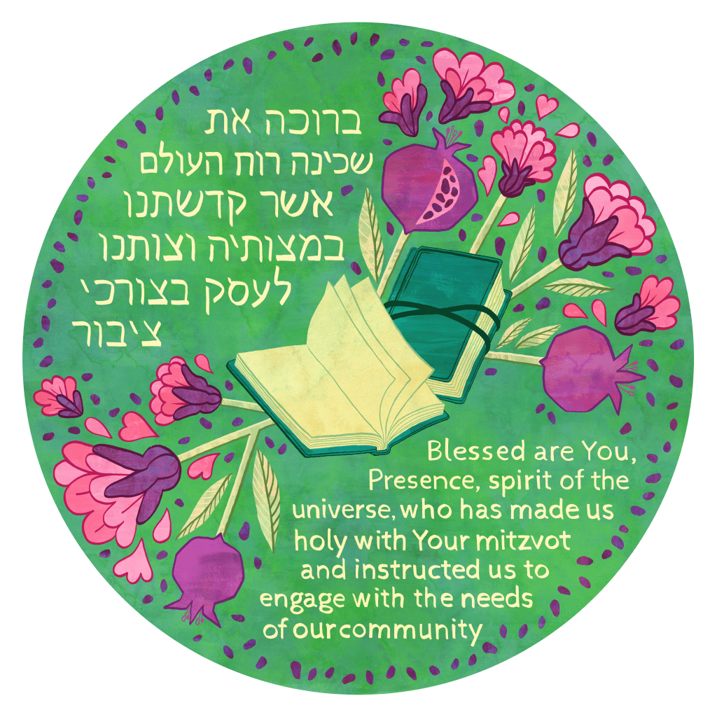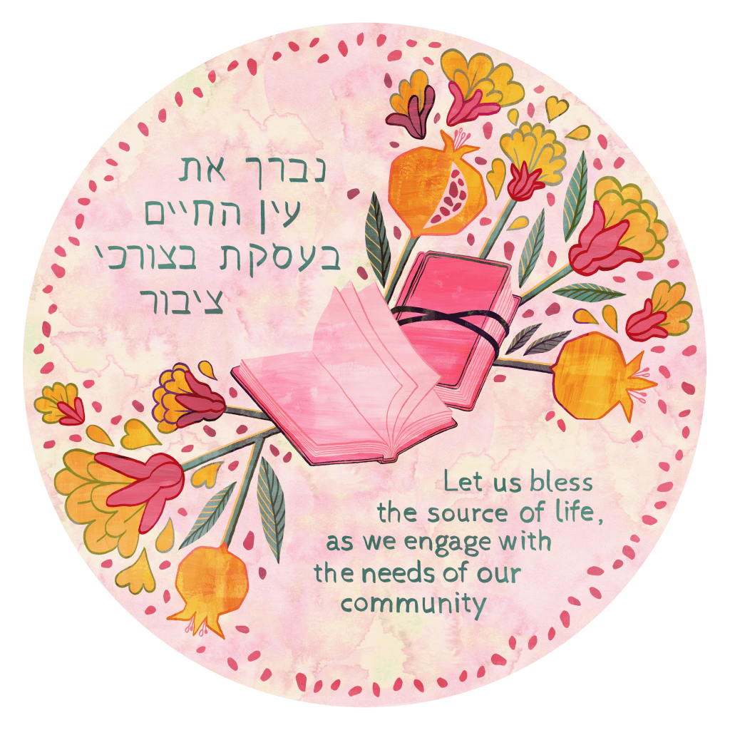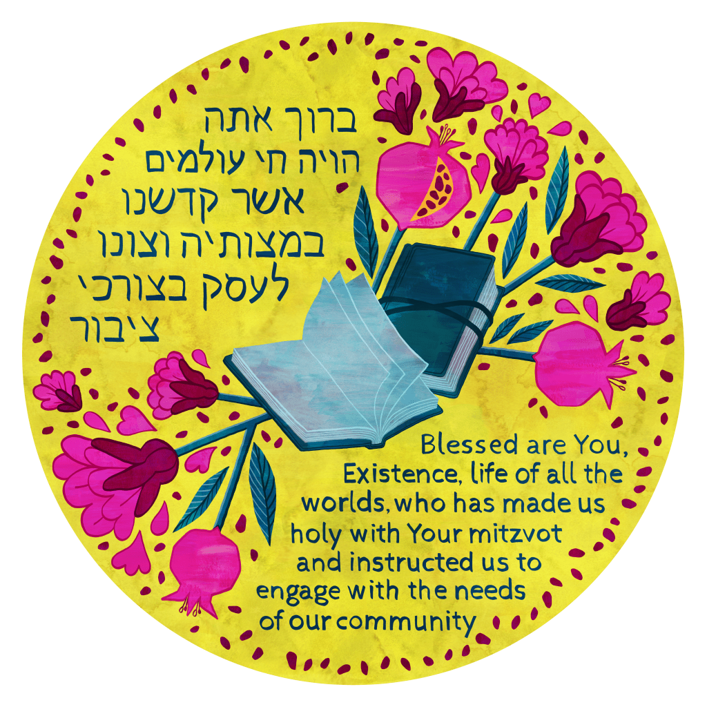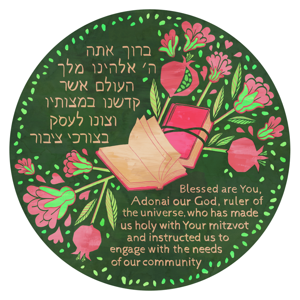I created these four images for a commissioner in late 2022. This is a Jewish blessing for community work and formation. Each piece is a variation of the blessing using different language to refer to Hashem, or a lack of language to refer to Hashem in the case of the non-theist variation (image 3). The commissioner asked to have pomegranates and books, both important culturally in Judaism, to be represented in the piece.