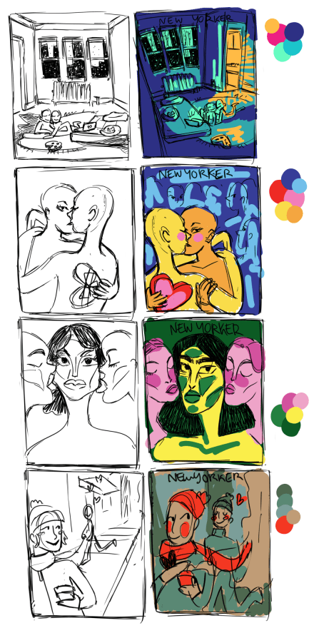 This assignment was to create a Valentine’s day themed mock-cover for the New Yorker. I chose a cool-colored palette because I wanted to convey a romantic scene without leaning heavily into the common red-pink-white color palette often associated with Valentine’s day and romance. The scene depicts a young couple who are just starting out in the city, content with each other and their cat and few belongings during the winter holiday. Below are a few ideations and color-stories and messed with before I decided on the scene I went with.