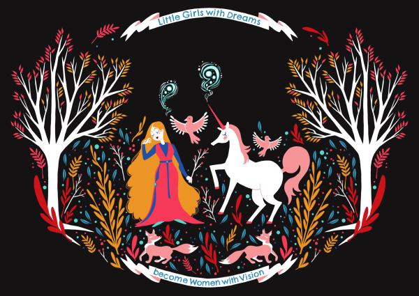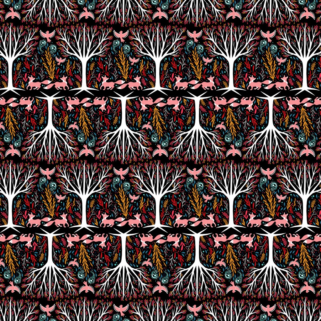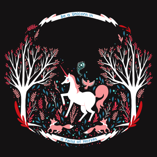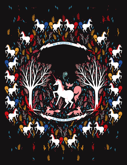The inspiration for this project came from my interest in medieval history. When I got the assignment in school to create patterns that could be used for children’s products, I wanted to draw from art history, specially tapestries like The Unicorn Rests in a Garden, and use colors appealing to modern children. I created the palette using bright pinks, yellows, and blues that would appeal to small children, and set them on a black background so that it gave it a mature elegance that might still appeal to a slightly older child.